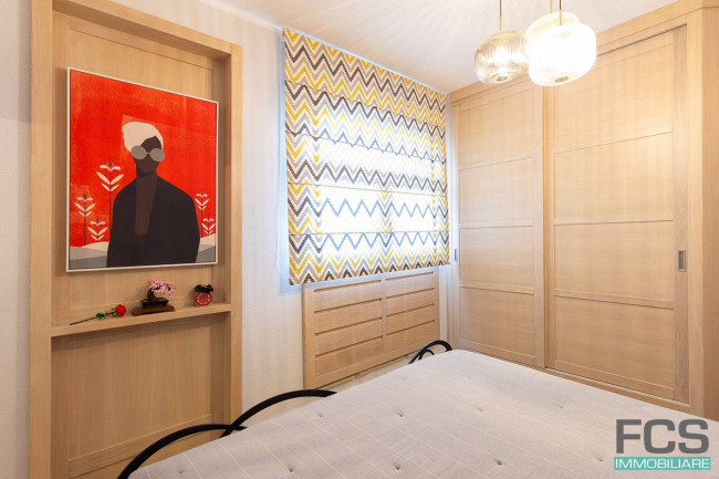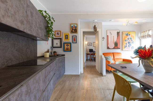 Un funzionale disimpegno separa la zona notte, che comprende una spaziosa camera matrimoniale e una seconda camera singola, attualmente adibita a studio, con accesso diretto al terrazzo privato. Il bagno, dotato di efficiente sistema di ventilazione, è attrezzato con box doccia. La proprietà viene venduta completa, fatta eccezione per il mobilio dello studio.